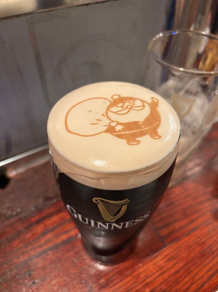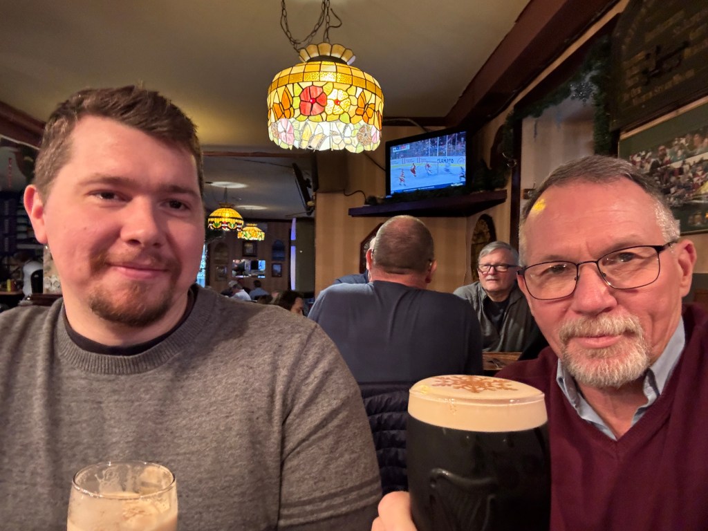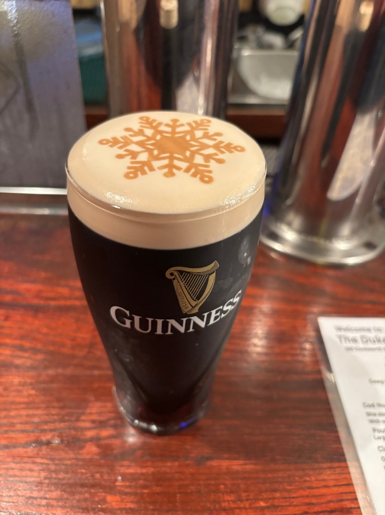 One of the things that for me makes life good is surprises. Not big surprises, like a party thrown in my honour that I was not aware of until I walked in the door and was greeted by the shouts of “surprise!!!” from the many assembled guests. Which did not happen, as I believe those closest to me know that this is not something I would enjoy. And certainly not bad surprises, like having my car break down ten days before Christmas with no garage able to even take a look at it until December 20th, and then informing me that it is a big job, but he hopes he can have it ready by December 23rd. Which did happen, and is the reason for my unexpected free day. No, not these. I like the pleasant little surprises, like discovering that the twelve-dollar bottle of wine I bought just to see what it was like is actually quite good. Or popping into a local pub, with my oldest son, for a pint of Guinness and having the beer arrive with a holiday image in the foam.